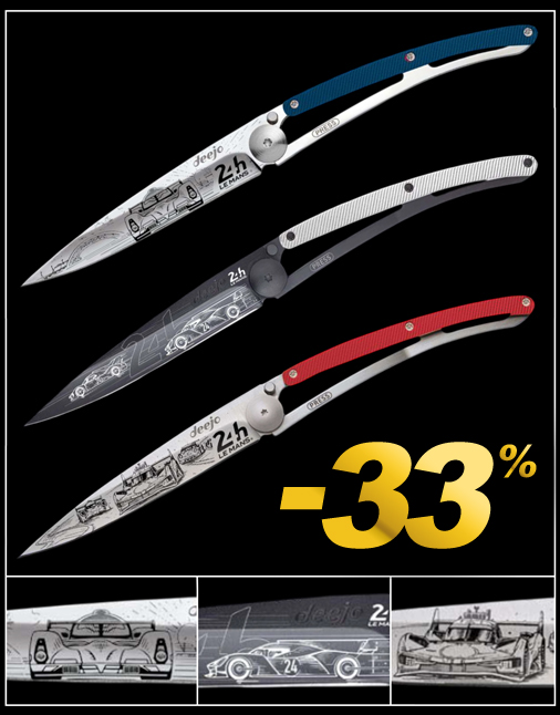 Set de 3 Couteaux Deejo 24h Le Mans Longueur fermé 11 cm - Lame en acier inoxydable gravée au laser - Poids 37g Manches en Aluminium Bleu / Blanc / Rouge - Longueur ouvert 20,5 cm Edition limitée - 240 exemplaires numérotés