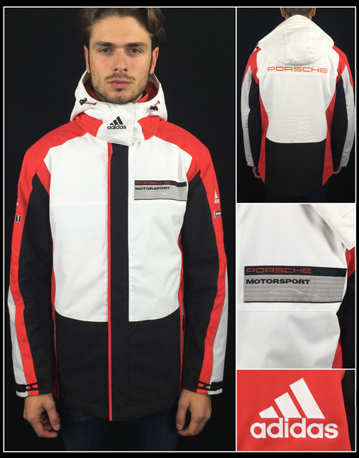 Veste à capuche homme Porsche Motorsport Adidas Capuche avec visière, tour de cou et cordons de serrage Couleur Noir / Blanc / rouge / gris - Coutures et fermetures étanches 5 poches intérieures - 2 poches extérieures Matière 100% nylon / Doublure 100 % polyester Porsche Design WAX20105