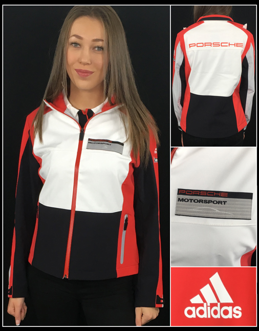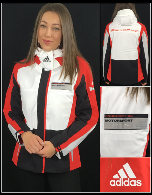 Veste femme Porsche Motorsport Adidas Couleur Noir / blanc / rouge / gris - Matière 77 % nylon / 23 % Elasthanne Coutures et fermetures étanches - Pattes de serrages aux manches 2 poches extérieures - 1 poches intérieure fermée Porsche Design WAX30103