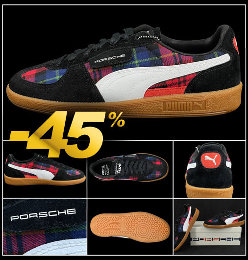 Chaussures mixtes Porsche 911 Turbo Insert aux couleurs Tartan Ecossais, en référence à l'intérieur de la 1ère Porsche 911 Turbo Matière cuir de vache et textile - Doublure en textile - Semelle en Caoutchouc Couleur Noir - Inclus deux paires de lacets Noir / Beige Puma 308415-01