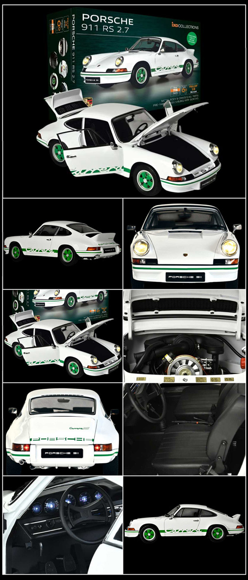 Kit Porsche 911 Carrera RS 2.7 1973 Kit à monter soi-même comprenant 713 pièces - Notice de montage illustrée incluse Portes, capot et coffre ouvrants - Phares fonctionnels - Sons réalistes du moteur et du klaxon Intérieur identique au réel vous permettant de replonger au coeur de la course Assemblage par vis sans colle pour une finition des plus parfaite Blanc Grand-Prix / Bandes Vertes 1/8 - Ixo Models 899,95 € TTC / Incl. Taxes