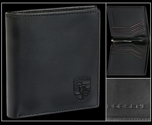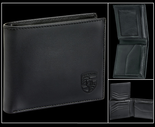 Portefeuille en Cuir Porsche 8 emplacements pour cartes - 1 compartiment pour les billets - Compartiment à monnaie 1 poche en filet - Matière 100% cuir pleine fleur - Couleur Noir - Protection RFID Dimensions fermé 12 x 9,5 x 1,5 cm Porsche WAP0300200TGBH 119,95 € TTC / Incl. Taxes