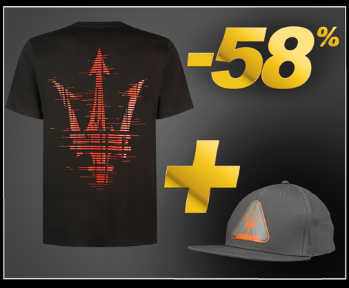 Casquette + T-shirt unisex Maserati Matière 100% Coton - Couleur T-shirt Noir - Couleur Casquette Gris / Orange Taille Casquette réglable Maserati 920031567 + 920031367