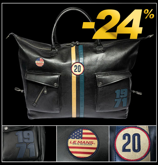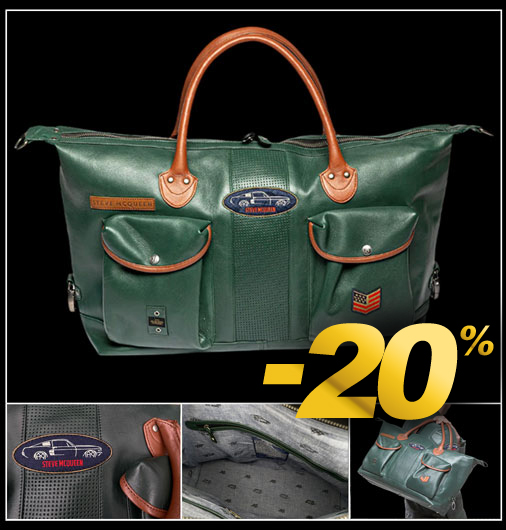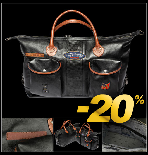 Sac de Voyage Steve McQueen Bullitt Grand contenant principal spacieux avec fermeture par zip 2 poches à pression sur le devant du sac - 2 anses non réglables 2 Couleurs disponibles - Dimensions 48 x 35 x 18 cm Matière Cuir de mouton de haute qualité Classic Legend Motors 27948