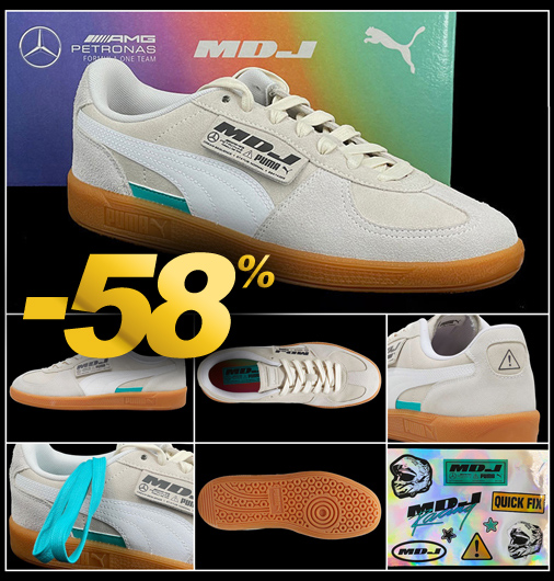 Chaussures mixte Mercedes-AMG F1 X Mad Dog Jones Matière du dessus en cuir de vache et textile - Couleur Beige Doublure en textile - Semelle rigide de haute qualité en Caoutchouc Inclus 2 paires de lacets noire / bleu - Stickers MDJ inclus Puma 308479-01