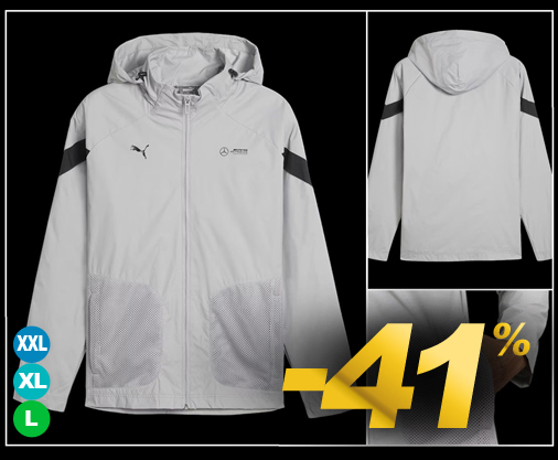 Veste à Capuche homme Mercedes-AMG F1 - Tailles L / XL / XXL seulement Matière 100% Polyamide - Couleur Gris - Capuche réglable Fermeture zippée - 2 poches latérales Puma 623739-02
