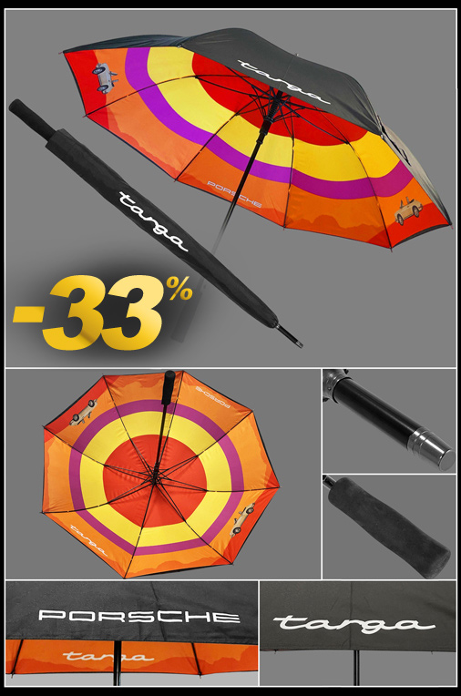 Parapluie XL Porsche 911 Targa Doublure intérieure inspirée de publicité pour le lancement de la Porsche 911 Targa Système coupe-vent avec baleines en fibre de verre - Ouverture automatique Poignée droite agrippante - Diamètre ouvert 110 cm - Longueur fermée 95 cm Couleur noir / orange / jaune / violet - Housse de rangement Porsche MAP15501025