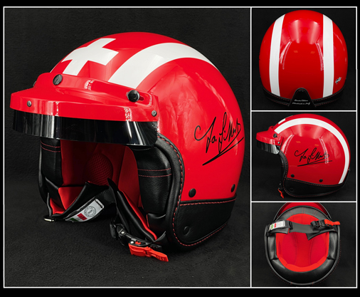 Casque Jo Siffert Signature Coque en matière thermoplastique - Norme E3 - Homologué 2025 Renfort et Habillage intérieur en cuir synthétique perforé Housse incluse - Couleur Rouge / Blanc Edition limitée - 200 exemplaires 379,95 € TTC / Incl. Taxes
