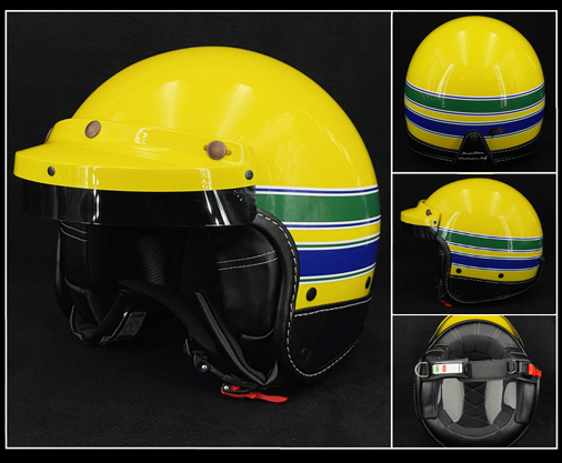 Casque inspiration Ayrton Senna Coque en matière thermoplastique - Norme E3 - Homologué 2025 Renfort et Habillage intérieur en cuir synthétique perforé Housse incluse - Couleur Jaune / Bleu / Vert 379,95 € TTC / Incl. Taxes