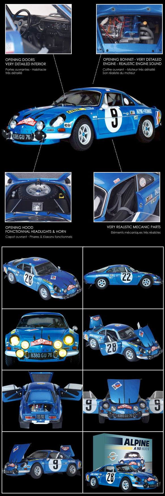 Kit Alpine A110 1600S - Vainqueur championnat du monde des rallyes 1971 Kit à monter soi-même comprenant 615 pièces - Notice de montage illustrée incluse Portes, capot et coffre ouvrants - Phares fonctionnels - Sons réalistes du moteur et du klaxon Intérieur identique au réel vous permettant de replonger au coeur de la course Assemblage par vis sans colle pour une finition des plus parfaite Stickers avec différents numéros inclus - 1/8 - Ixo Models