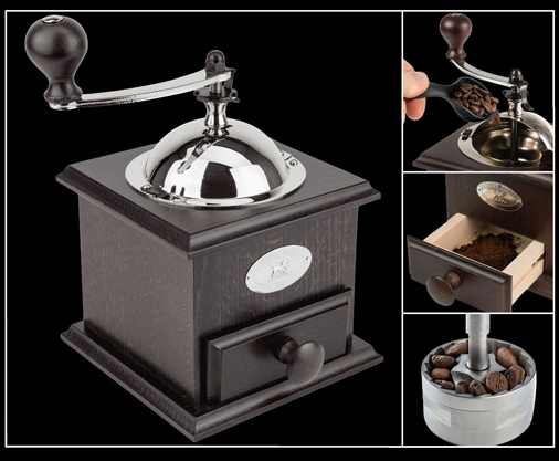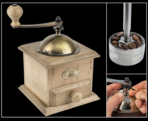 Moulin à Café Manuel Peugeot Mécanisme en acier redoutable, garanti sans limitation de durée - Tiroir de récupération Matière Bois de Hêtre patiné à la main - Trémie fermée Réglage de votre mouture par molette 199,95 € TTC / Incl. Taxes
