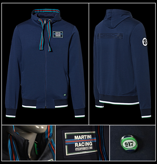 Veste à capuche homme Porsche Martini 917 Collection Couleur bleu foncé - Matière 75% Coton / 20% polyester Pins 917 et bandes tricolores - 2 poches latérales Porsche WAP556LMRH 139,95 € TTC / Incl. Taxes