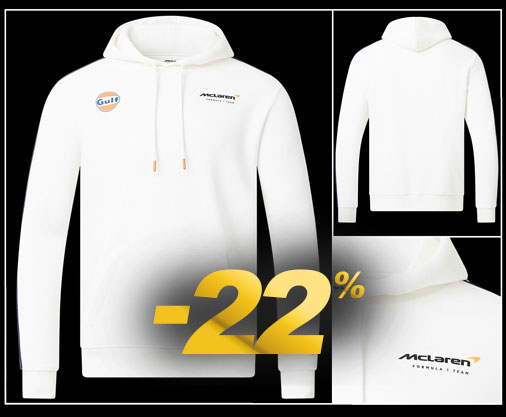 Hoodie homme Gulf McLaren F1 Team Capuche réglable par cordon de serrage - Poche kangourou Taille et manches côtelées - Couleur Blanc - Matière Coton McLaren TM3413