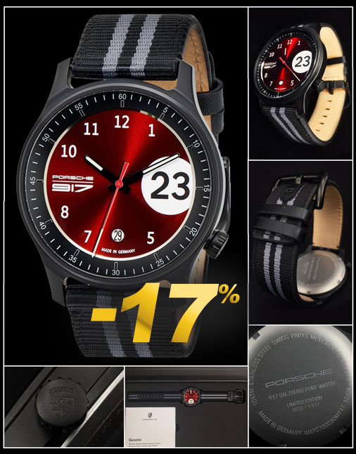 Montre Chronographe Porsche 917 Salzburg n°23 Mouvement quartz Swiss Parts Ronda 515 - Boîtier aluminium trempé Verre minéral avec revêtement saphir - Bracelet cuir / textile avec boucle en acier inoxydable Boîtier étanche 10 ATM - Diamètre 42 mm - Epaisseur 10 mm Garantie 2 ans - Made in Germany Porsche WAP0700030M917