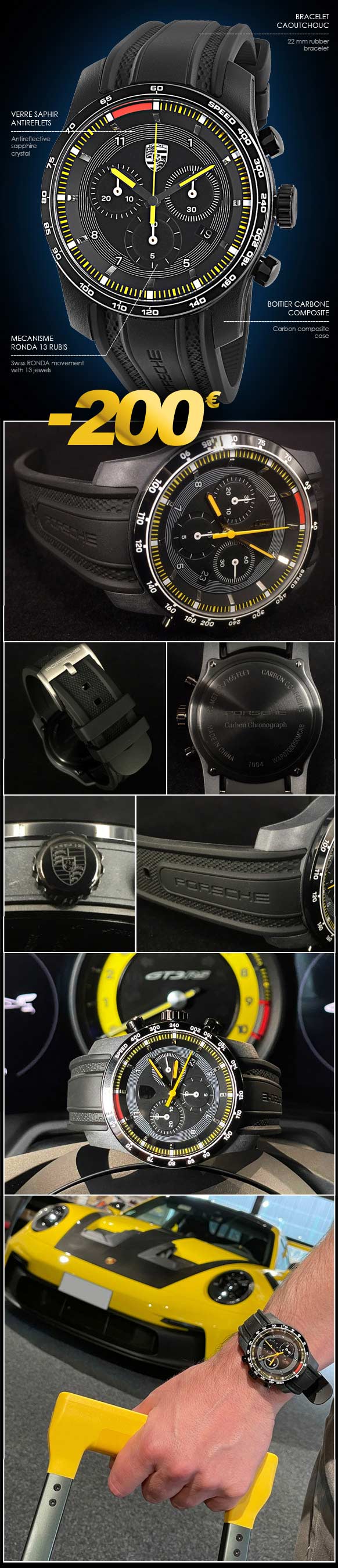 Montre Porsche Chronographe Carbon Composite Mouvement Suisse RONDA 13 rubis - Boîtier en alliage carbone avec finition satinée Bracelet caoutchouc 22 mm - Verre saphir traité antireflets - Guichet de date à 4 heures Fonction d'arrêt intégrée - Dos gravé avec numéro de série - Etanche à 50 mètres / 5 ATM Diamètre 42 mm - Epaisseur 12 mm - Garantie 2 ans Porsche WAP0700050MCRB