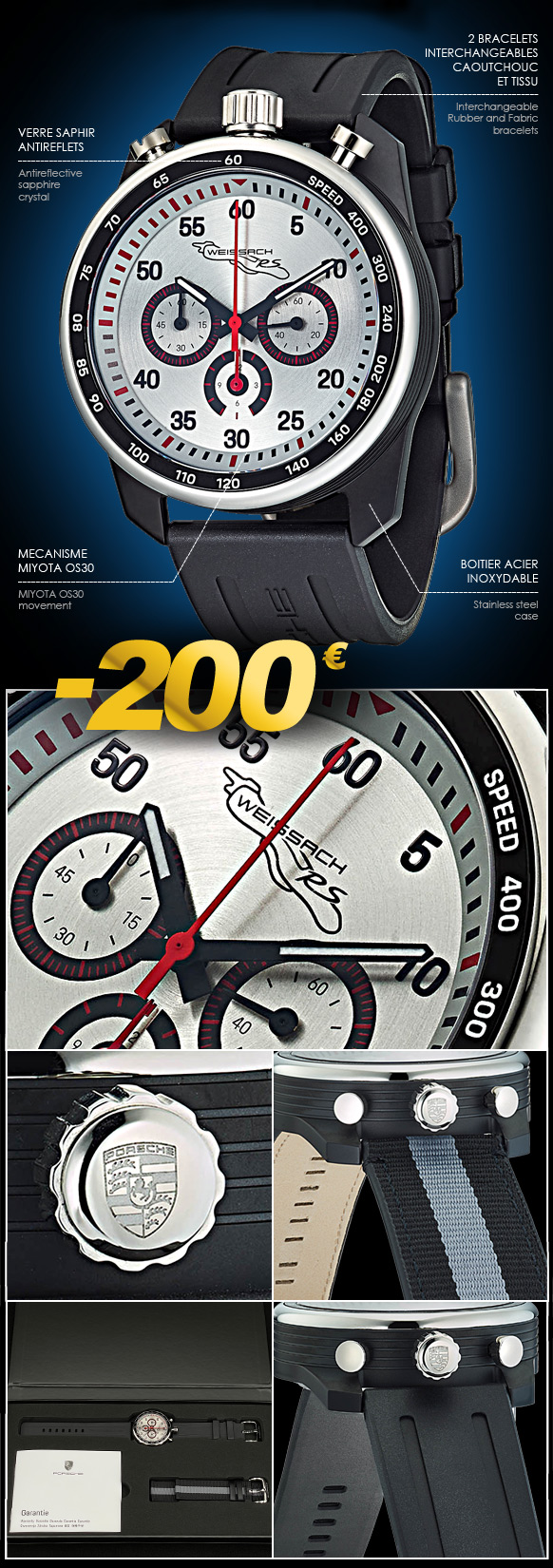 Montre Porsche Chronographe Weissach RS 50 Ans Mouvement Miyota OS30 - Cadran argenté, radial et poli - Boitier acier inoxydable Diamètre 42 mm - Présentée en coffret avec un second bracelet textile bicolore Bracelet 22 mm en caoutchouc noir - Fonction d'arrêt intégrée Couronne vissée et poussoir à 12h - Etanche 10 ATM Garantie 2 ans - Fabriqué en Allemagne Porsche WAP0700090NRA