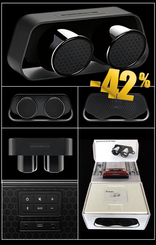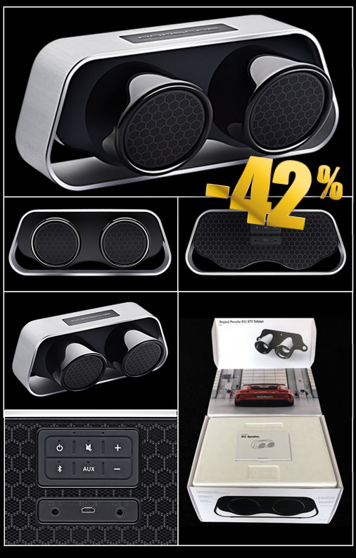 Enceinte Bluetooth Porsche - Collection Masterpieces Design inspiré par les sorties d'échappement de la 911 GT3 Diffusion sans fil à partir d’un smartphone, tablette ou ordinateur Puissance 60 watts - Couleur chrome - Dimensions 290 x 155 x 120 mm Made in Germany - Porsche WAP0501100L
