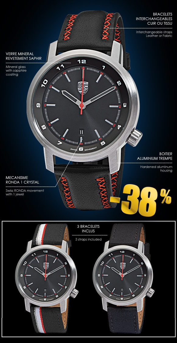 Montre Chronographe Porsche - Essential 911 Silver Edition Mouvement Suisse Ronda 1 cristal - Bracelet cuir noir, surpiqûres rouges Deux bracelets tissu avec mécanisme de remplacement rapide inclus Boucle ardillon acier inoxydable - Verre minéral avec revêtement saphir Etanche jusqu'à 10 ATM / 100 m - Diamètre 43 mm - Garantie 2 ans Porsche WAP0700010J