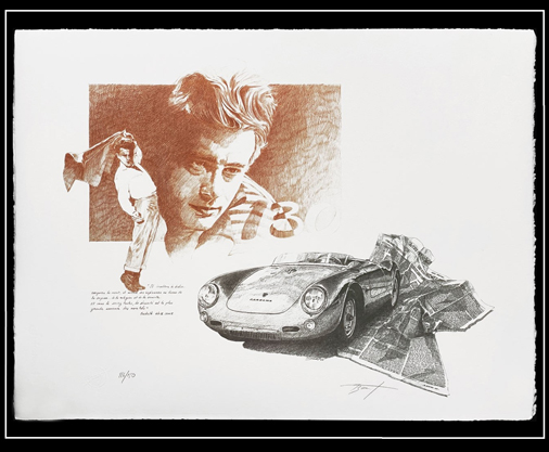 Reproduction d'une peinture originale de Patrick Brunet - James Dean Porsche 550 50 x 65 cm - Sur papier d'art certifié et authentifiée Edition limitée - 250 exemplaires numérotés 99,95 € TTC / Incl. Taxes