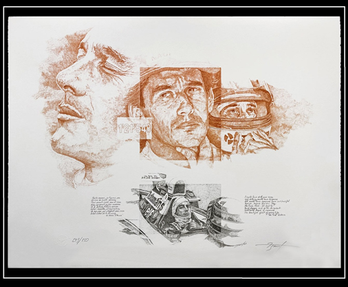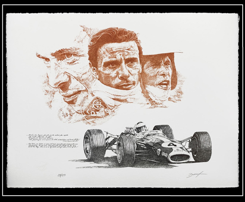 Reproduction d'une peinture originale de Patrick Brunet - Jim Clark Lotus Cosworth 50 x 65 cm - Sur papier d'art certifié et authentifiée Edition limitée - 250 exemplaires numérotés 99,95 € TTC / Incl. Taxes