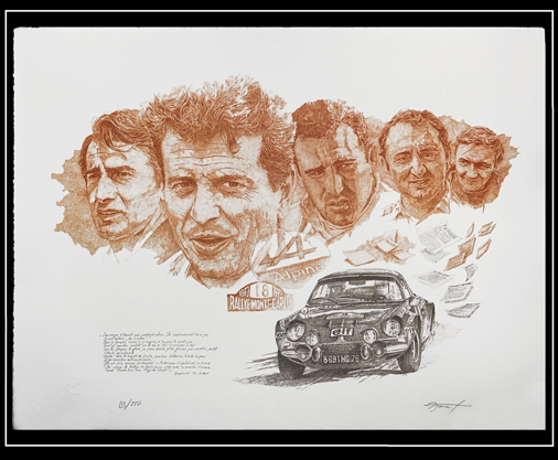 Reproduction d'une peinture originale de Patrick Brunet Andruet Andersonn Nicolas Therier Piot - Alpine A110 Monte Carlo 1973 58 x 75 cm - Sur papier d'art certifié et authentifiée Edition limitée - 250 exemplaires numérotés 99,95 € TTC / Incl. Taxes