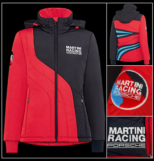 Veste à Capuche femme Porsche Martini Racing Matière 100% Polyester - Fermeture principale zippée - Couleur Rouge / Bleu marine 2 grandes poches latérales zippées - Capuche amovible Porsche WAP555P0MR 249,95 € TTC / Incl. Taxes