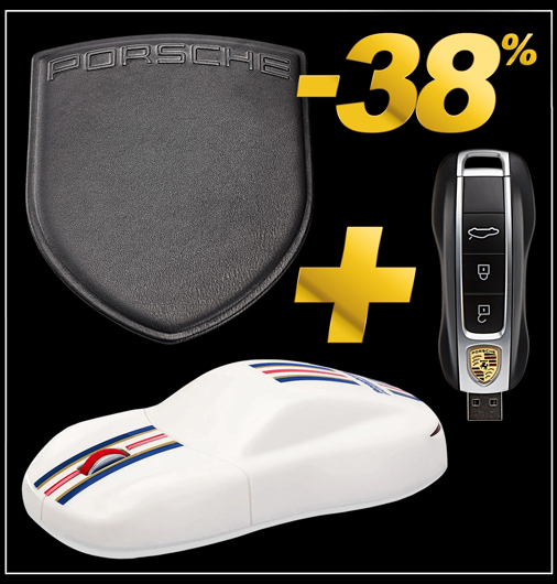 Trio Souris sans fil + Tapis de Souris + Clé USB Porsche Souris sans fil Porsche 911 60 ans pour PC et Mac - 2 boutons - 1 molette tridirectionnelle Tapis de Souris Porsche 100% Cuir - Dimensions 24 x 18.9 x 0.5 cm Clé USB Porsche 64 GO - Prise USB rétractable Porsche WAP0508140R060 + WAP050020MPAD + WAP0507150M001