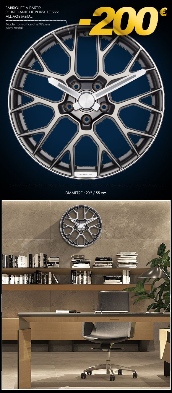Horloge Murale Fabriquée à partir d'une jante de la nouvelle Porsche 911 Diamètre 20' / 55 cm - Poids 8,7 kg - Matériau Alliage métal Couleur Gris argent - Deux aiguilles allégées - Fonctionne avec pile AA Porsche WAP0700110L