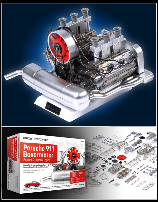 Moteur Porsche Boxer Flat-6 Version améliorée - Réplique entièrement fonctionnelle 290 pièces à monter soi-même - Socle de présentation inclus Bouton de mise en marche avec cycle "son et lumières" Nouveau module son plus puissant avec sortie audio - Fonctionne avec 3 piles AAA Superbe manuel illustré en anglais et allemand, format A4 Echelle 1/4 - Edition Porsche Museum