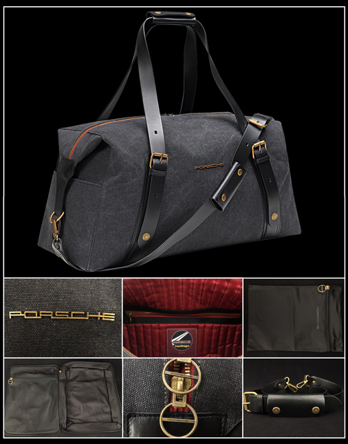Sac de voyage Porsche Heritage Weekender Couleur Gris anthracite / Or / Rouge bordeaux - Contenance 96 l Dimensions 28 x 43 x 60 cm - Bandoulière et poignées réglables en cuir noir Intérieur matelassé avec grande poche zippée - Porte étiquettes en cuir noir avec rabat Trois compartiments pour chaussures, vêtements et accessoires Porsche WAP0350110LHRT 479,95 € TTC / Incl. Taxes