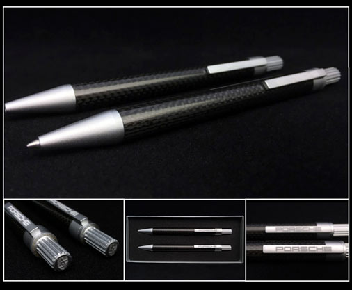 Set de 2 stylos à bille Porsche Design en carbone Set d’écriture composé d’un stylo à bille et d’un stylo roller Écusson Porsche gravé au laser sur le haut du bouton tournant À mécanisme tournant - Recharges interchangeable Corps en carbone véritable - Longueur 14,5 cm Fabriqué en Allemagne - Porsche WAP0514000F