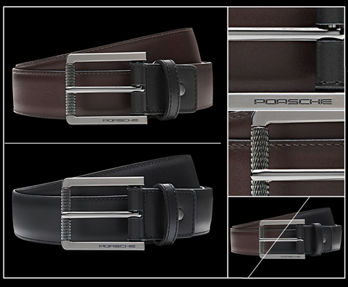 Ceinture Porsche en cuir réversible Pour homme ou femme - Couleur 1 face noir / 1 face marron Écusson Porsche gravé au laser sur le haut du bouton tournant Longueur réglable (max 140cm) - Largeur 35 mm Porsche WAP6600090MESS 89,95 € TTC / Incl. Taxes