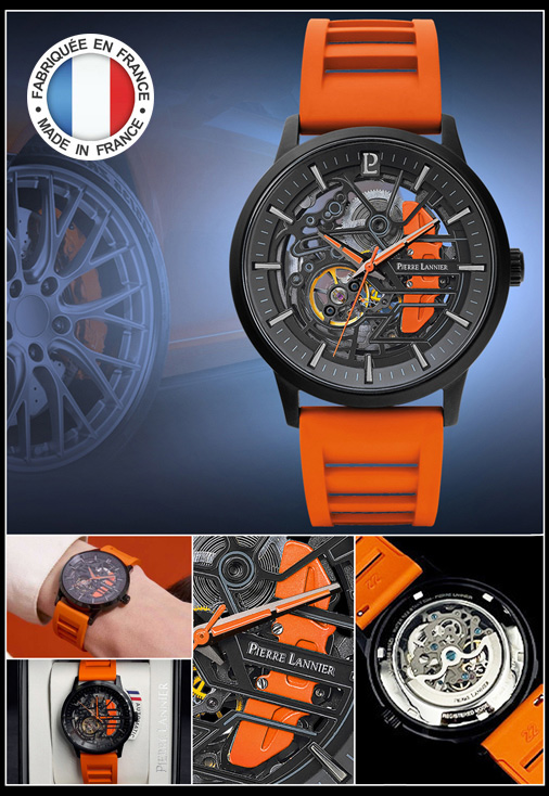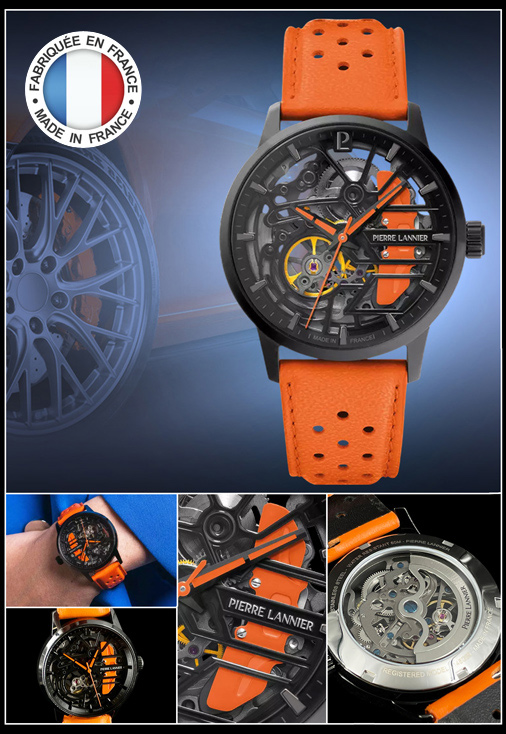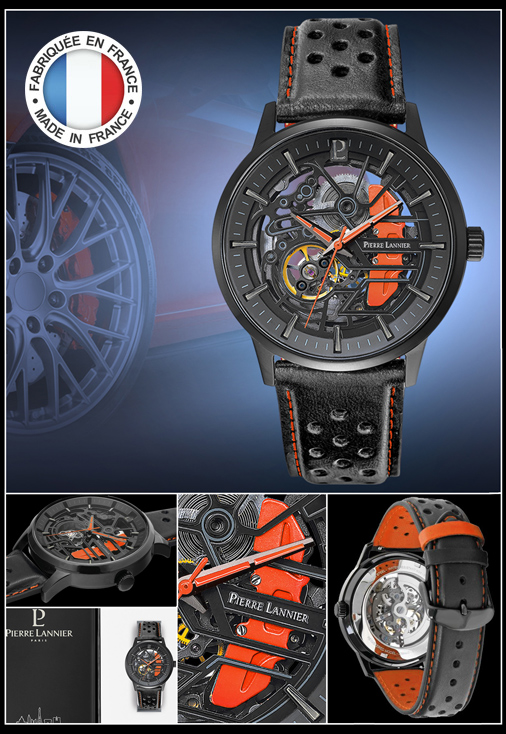 Montre automatique Pierre Lannier Paddock Fond cadran squelette - Représentation d'un étrier de frein - Bracelet en cuir Boitier en acier inoxydable noir - Verre antireflets saphir - Couleur Noir / Orange Etanche à 50 mètres - Diamètre 43 mm - Garantie 2 ans Made in France - Pierre Lannier 338A455 279,95 € TTC / Incl. Taxes